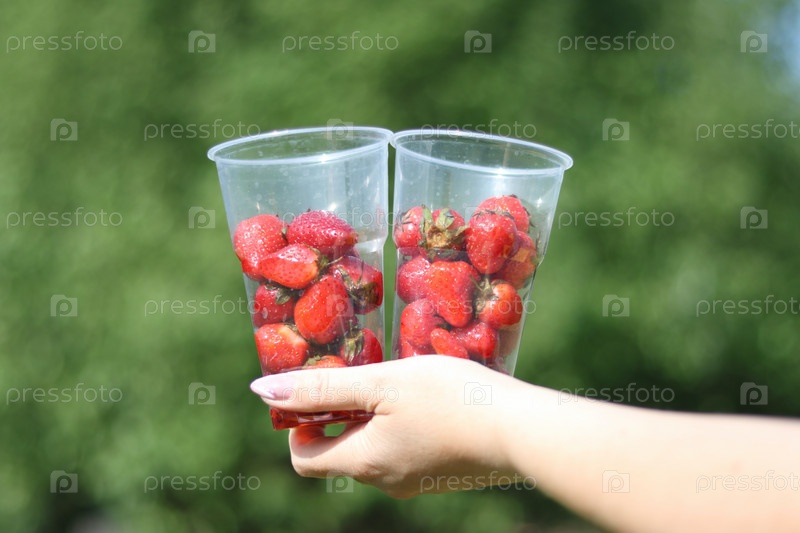Женщина держит на вытянутой руке два пластиковых стакана с клубникой. На фоне зеленой растительности. Крупный план