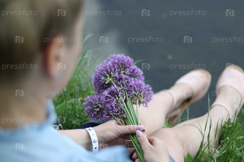 Женщина с букетом лука. Сидя у озера. Снято со спины. Крупный план