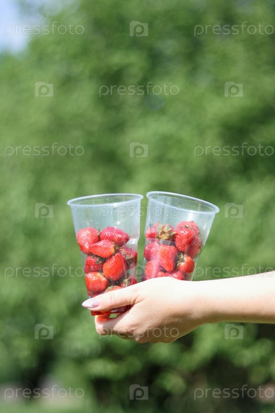 Женщина держит на вытянутой руке два пластиковых стакана с клубникой. На фоне зеленой растительности. Крупный план