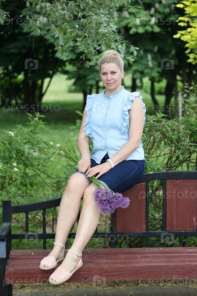 Поясной портрет женщины с букетом полевых цветов. Сидит на скамейке в парке. Смотрит в камеру