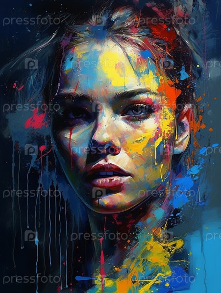 Портрет красивой девушки с красочными пятнами краски.Изображение полностью генерируется с использованием Ai