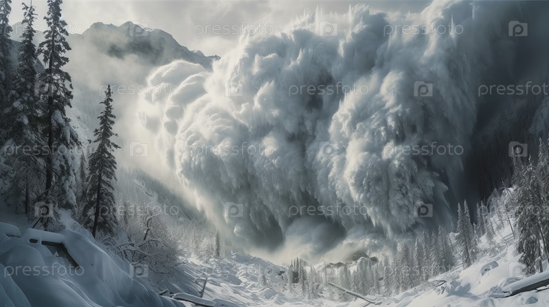 Лавина сходит с гор, ломая деревья и снося все на своем пути
