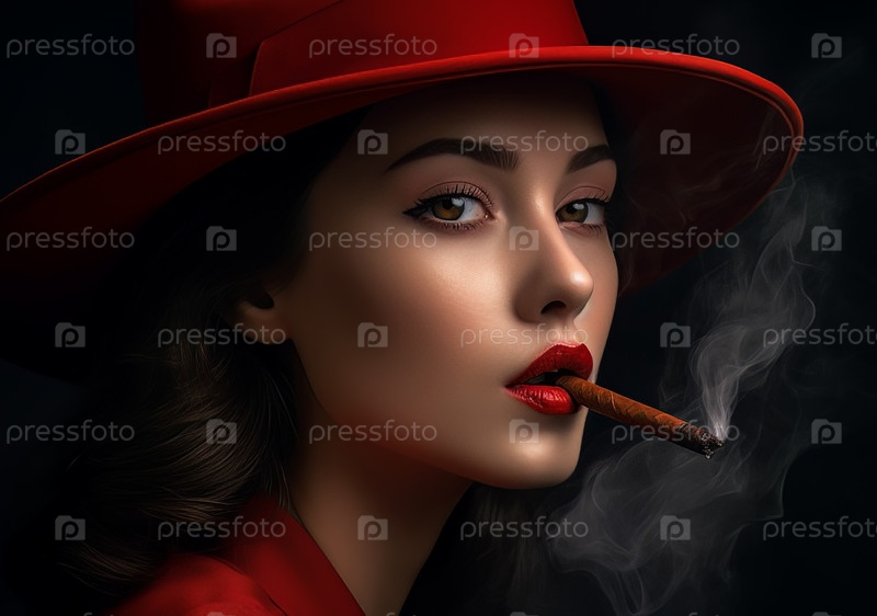 Портрет красивой молодой женщины в красной шляпе с сигарой во рту