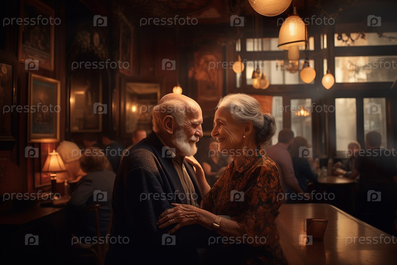 Пара пожилых людей, танцующих в кафе и нежно смотрящих друг на друга, полностью сгенерированных Ай