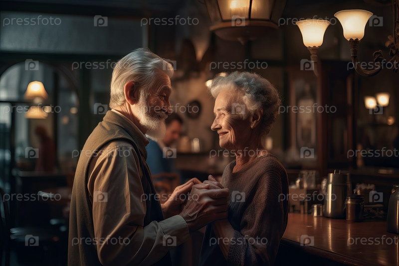 Пара пожилых людей, танцующих в кафе и нежно смотрящих друг на друга, полностью сгенерированных Ай