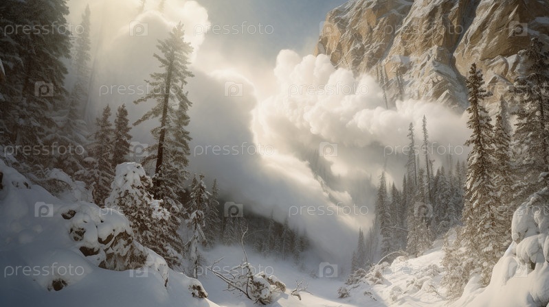 Лавина сходит с гор, ломая деревья и снося все на своем пути