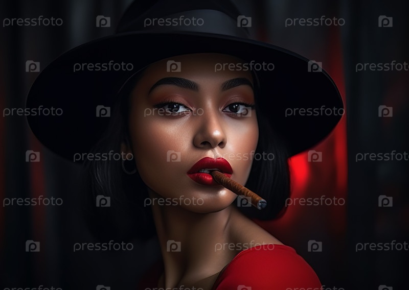 Портрет красивой молодой женщины в шляпе и красном платье с сигарой