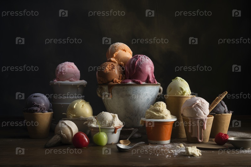 Натюрморт из разнообразного мороженого, украшенного фруктами, вафлями и шоколадом. Сгенерировано Ай