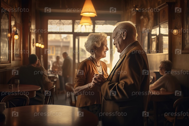 Пара пожилых людей, танцующих в кафе и нежно смотрящих друг на друга, полностью сгенерированных Ай