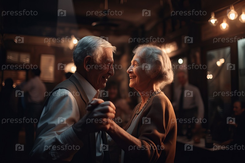Пара пожилых людей, танцующих в кафе и нежно смотрящих друг на друга, полностью сгенерированных Ай