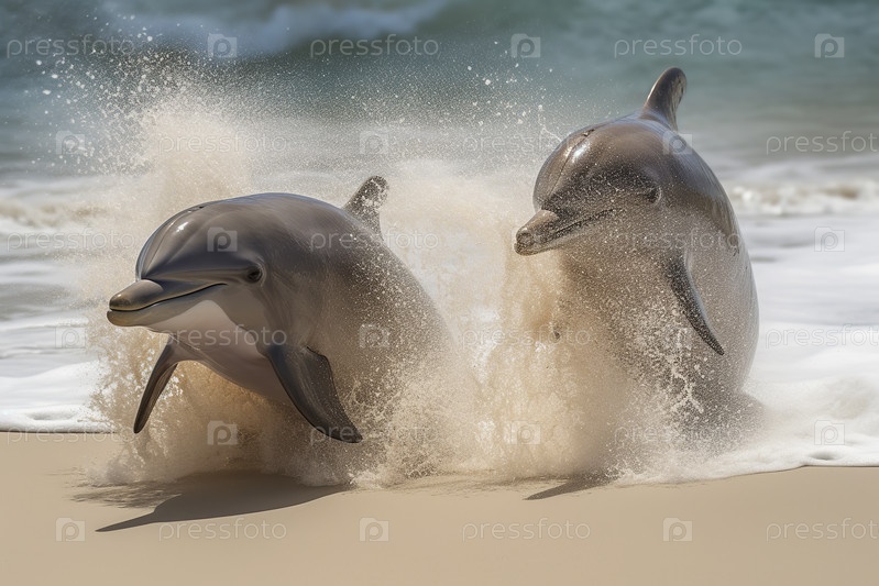 Дельфины играют у берега, выпрыгивая из воды с пятнами воды и песка, Сгенерирован Ai
