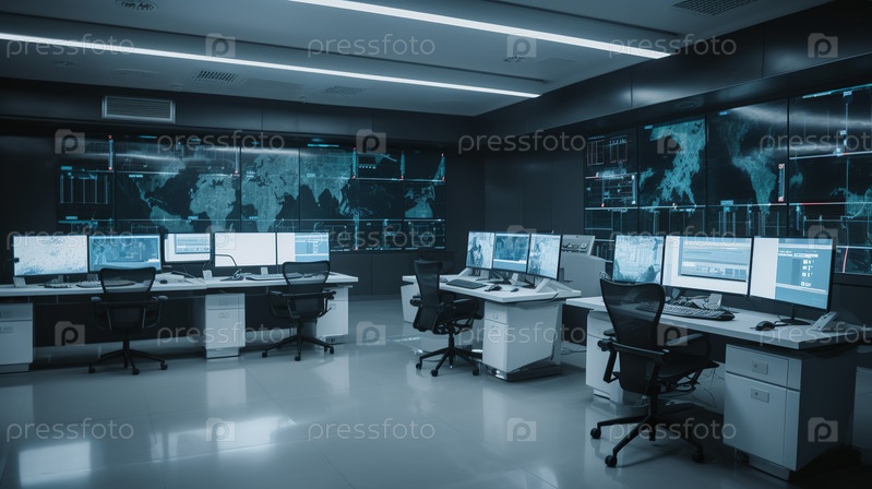 Пустой ситуационный центр, интерьер большой современной комнаты управления безопасностью, рабочее место с несколькими дисплеями, комната мониторинга с пустым офисом в центре обработки данных безопасности