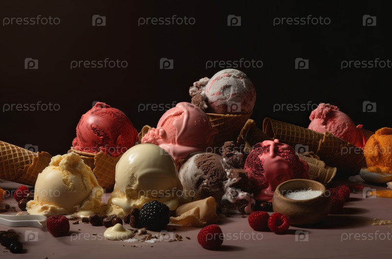 Натюрморт из разнообразного мороженого, украшенного фруктами, вафлями и шоколадом. Сгенерировано Ай
