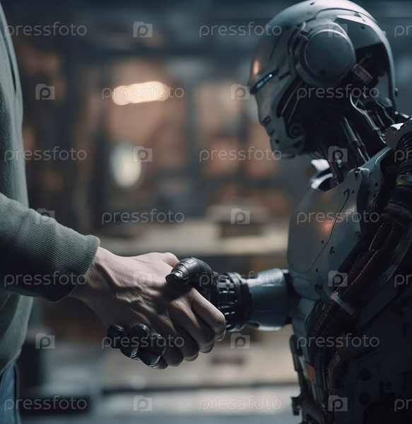 Мужчина пожимает руку роботу-киборгу, концептуальное изображение, созданное искусственным интеллектом
