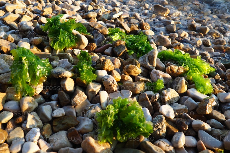 Ульва, род зеленых морских водорослей семейства Ulvaceae. Многие виды съедобного моревого салата. Водолеи выбрасываются волной на камне. Черногория, Адриатическое море, Средиземное море. Которский залив