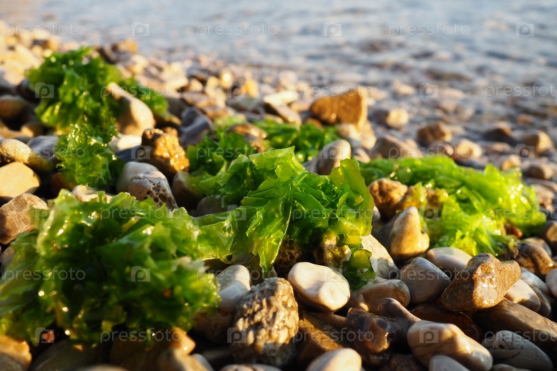 Ульва, род зеленых морских водорослей семейства Ulvaceae. Многие виды съедобного моревого салата. Водолеи выбрасываются волной на камне. Черногория, Адриатическое море, Средиземное море. Которский залив