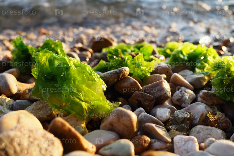 Ульва, род зеленых морских водорослей семейства Ulvaceae. Многие виды съедобного моревого салата. Водолеи выбрасываются волной на камне. Черногория, Адриатическое море, Средиземное море. Которский залив