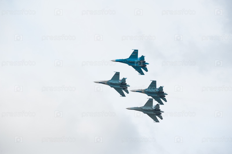Нижний Тагил, Россия - 25 сентября. 2013: Показательные выступления летной группы "Соколы России" на Су-27. Выставка РАЭ-2013. Россия Оружие Экспо-2013