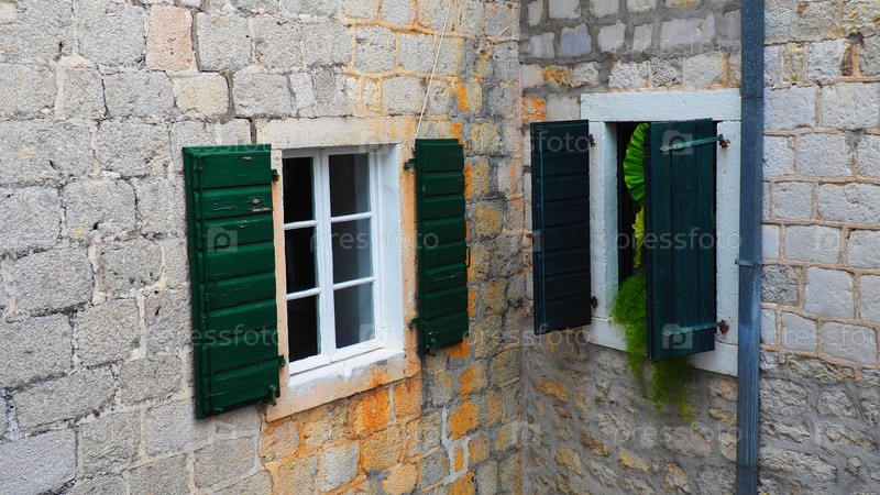 Старое окно с зелеными закрытыми ставнями на старом доме. Винтажная текстура. Герцег-Нови, Черногория, старый каменный дом. Архитектура Адриатического региона. Крепление окон и ставней к стене
