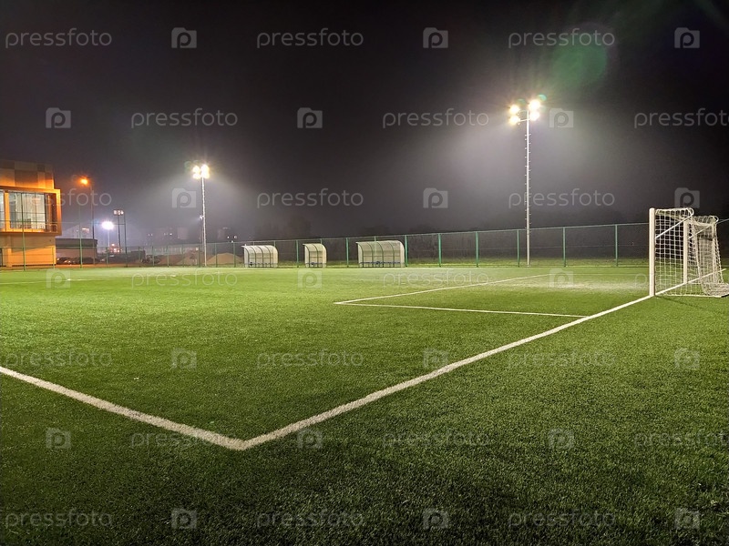 Стадион в огнях и вспышках. Пустое красивое футбольное поле со светящимися прожекторами вечером или ночью. Искусственный газон. Эффект тумана или дыма. Футбольные ворота