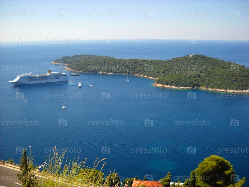 Аэрофотосъемка Адриатического моря. Остров недалеко от Дубровника, Хорватия. Красивая голубая поверхность моря с кораблями, шлюпками, яхтами и лайнером. Светлые пятна на воде. Сосны и сухая трава