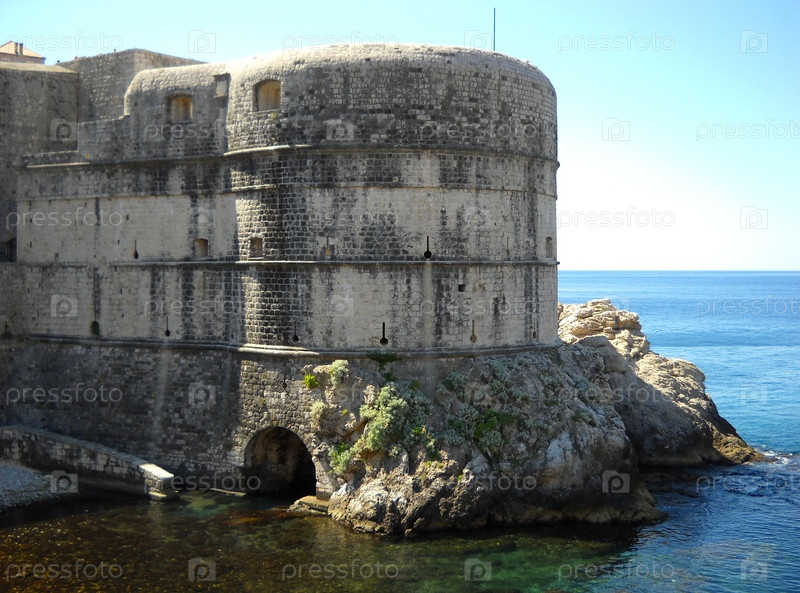 Дубровник, Далмация, Хорватия, 5 августа 2010 г. Форт Бокар. Здание украшено красивой каменной диадемой вокруг вершины сооружения. Защита главных ворот. Фортовая архитектура