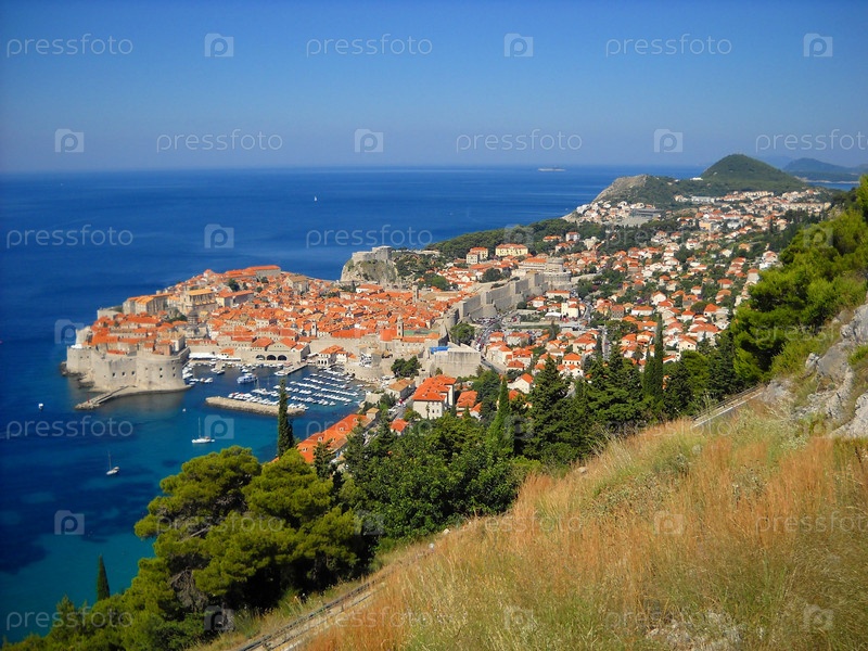 Дубровник, Хорватия, вид сверху со скалы. Голубое Адриатическое море, старый город лежит у подножия горы. Крыши из красной черепицы выглядят ярко в солнечную погоду. Туристическое направление