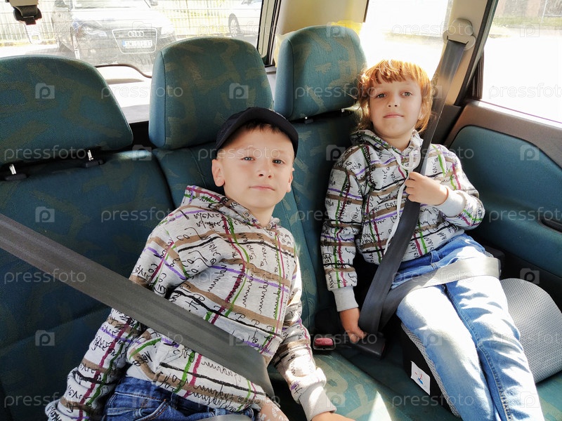 Дети в машине. На заднем сиденье сидят мальчик и девочка, смеются и гримасничают. Дети пристегивают ремни безопасности. Ребенок в кепке. Дети - разнолицые близнецы, одетые в одинаковую одежду