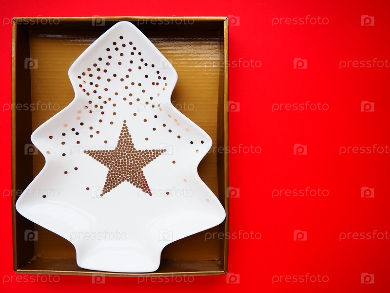 Тарелка в виде елочки с золотыми украшениями и звездой посередине. Подарочная упаковка. Красный фон. Новогодняя рождественская открытка. Фон для рекламы и надписей. Скопируйте пространство