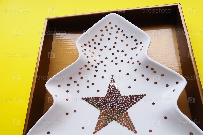 Тарелка в виде елочки с золотыми украшениями и звездой посередине. Подарочная упаковка. Желтый фон. Новогодняя рождественская открытка. Фон для рекламы и надписей. Скопируйте пространство
