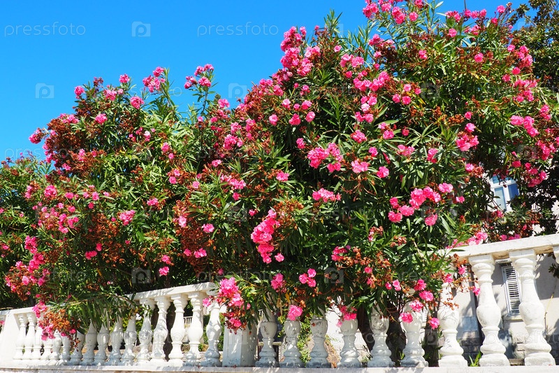 Олеандр, Nerium oleander Apocynaceae, представляет собой ядовитый кустарник. Его используют в садах из-за его розовых цветов. Побережье Герцег-Нови, Черногория. Адриатическое море Средиземное море. Красивая белая балюстрада