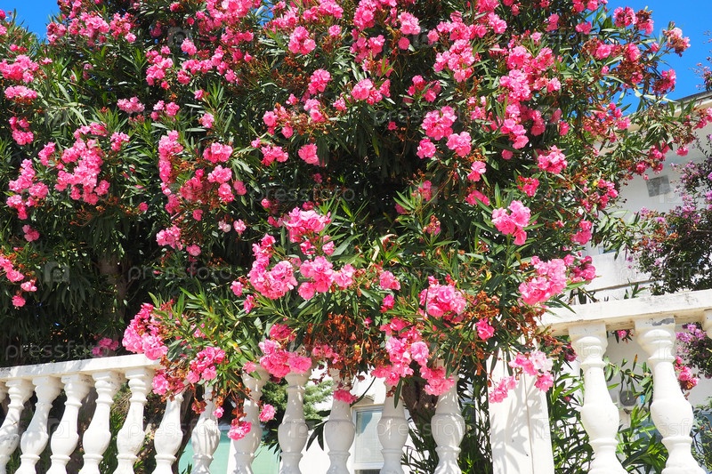 Олеандр, Nerium oleander Apocynaceae, представляет собой ядовитый кустарник. Его используют в садах из-за его розовых цветов. Побережье Герцег-Нови, Черногория. Адриатическое море Средиземное море. Красивая белая балюстрада