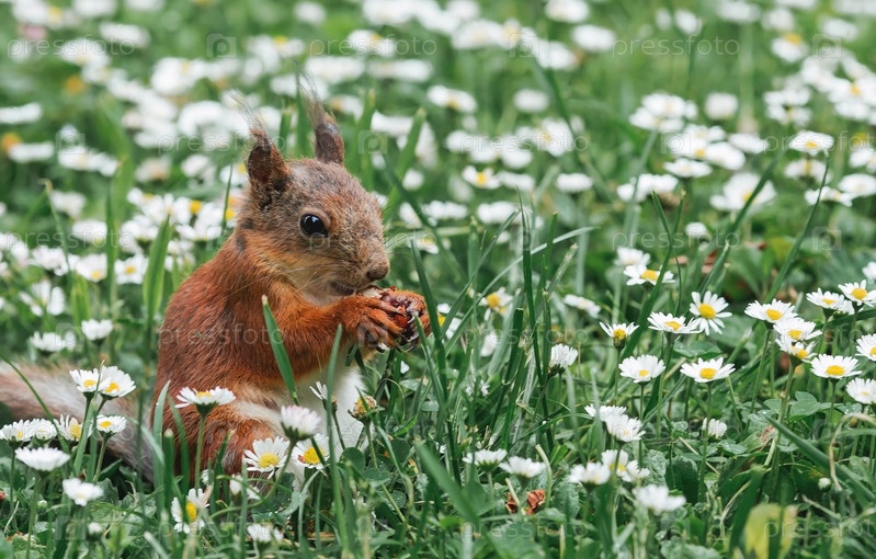 Лето. Портрет пушистой рыжей белки с орехом в лапах на зеленой траве в окружении маргариток. Белки в городском парке Царицыно. Кормление животных