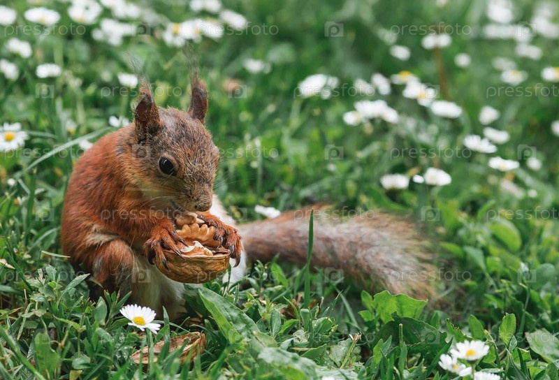 Лето. Портрет пушистой рыжей белки с орехом в лапах на зеленой траве в окружении маргариток. Белки в городском парке Царицыно. Кормление животных