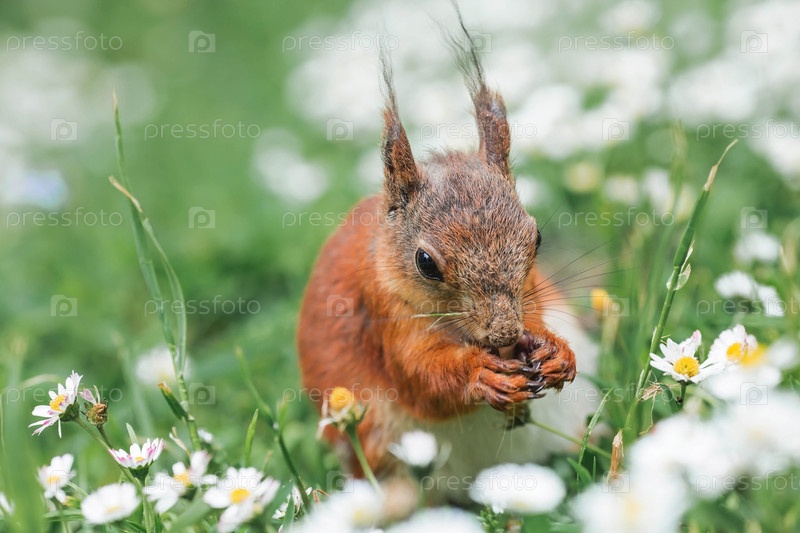 Лето. Портрет пушистой рыжей белки с орехом в лапах на зеленой траве в окружении маргариток. Белки в городском парке Царицыно. Кормление животных