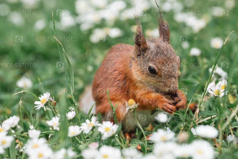 Лето. Портрет пушистой рыжей белки с орехом в лапах на зеленой траве в окружении маргариток. Белки в городском парке Царицыно. Кормление животных