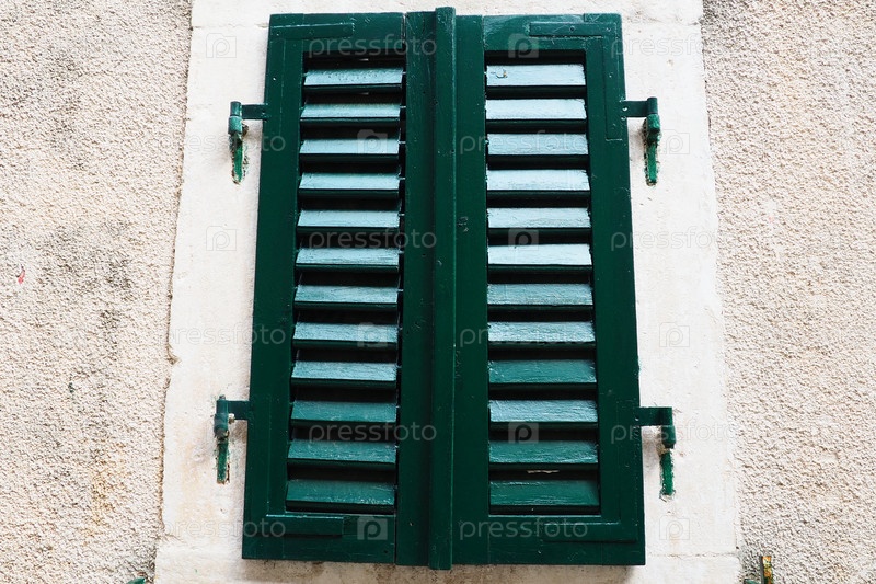 Старое окно с зелеными закрытыми ставнями на старом доме. Старинный фон, текстура