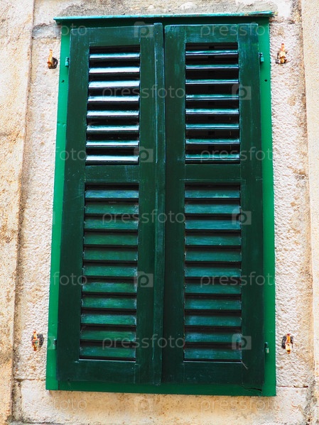 Старое окно с зелеными закрытыми ставнями на старом доме. Винтажная текстура. Герцег-Нови, Черногория, старый каменный дом. Архитектура Адриатического региона. Крепление окон и ставней к стене