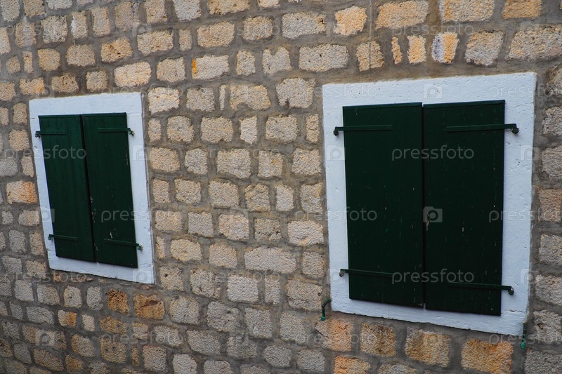 Старое окно с зелеными закрытыми ставнями на старом доме. Винтажная текстура. Герцег-Нови, Черногория, старый каменный дом. Архитектура Адриатического региона. Крепление окон и ставней к стене