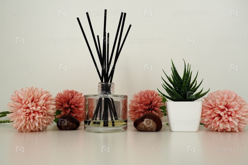 Композиция из розовых искусственных цветов, ароматических палочек в стеклянной вазе с эфирным маслом. Натюрморт на белом столе. Цветок алоэ в белом горшке. Оформление комнат и квартир, дизайн интерьера