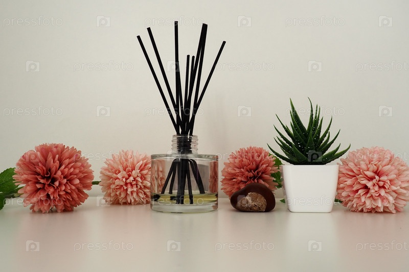 Композиция из розовых искусственных цветов, ароматических палочек в стеклянной вазе с эфирным маслом. Натюрморт на белом столе. Цветок алоэ в белом горшке. Оформление комнат и квартир, дизайн интерьера