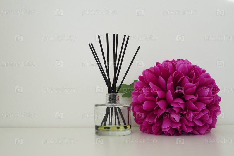 Композиция с ароматическими палочками, эфирным маслом в стеклянной вазе и ярким розово-сиреневым махровым искусственным цветком в интерьере белой комнаты. Белый фон