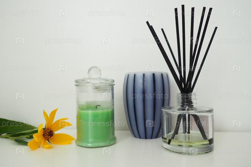 Цветок топинамбура. Ароматические свечи на белом фоне. Ароматические палочки, пропитанные эфирным маслом. Стеклянный сосуд с маслом. Натюрморт. Полосатая свеча восковая в прозрачной банке с крышкой