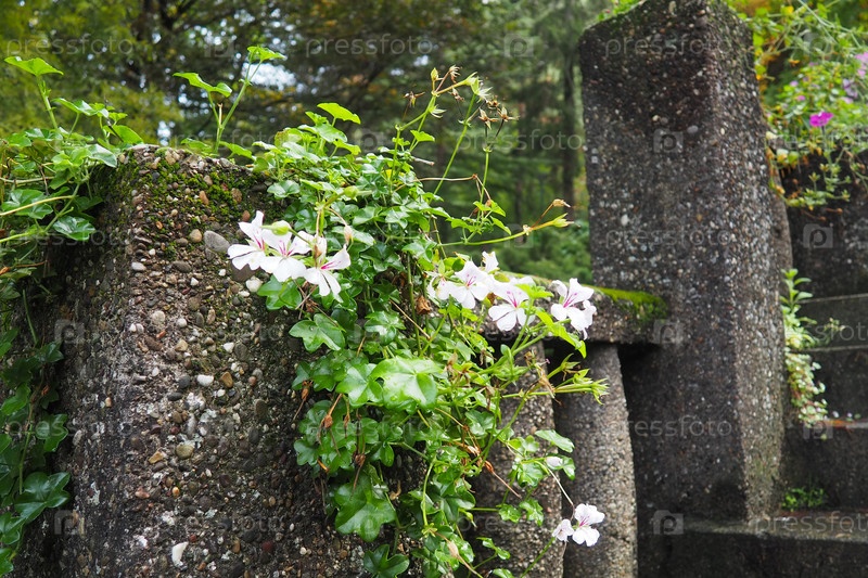 Цветущая белая плющелистная герань-пеларгония в вертикальном дизайне озеленения улиц и парков. Красивая крупная пеларгония-герань-герань. Цветоводство и садоводство. Баня Ковиляча