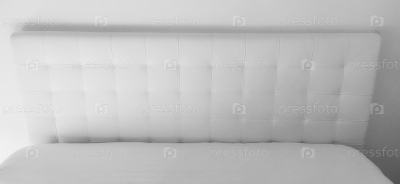 Мягкое изголовье. Обивка для мебели из натуральной или искусственной кожи и стеганой ткани. Мягкое изголовье у светлой стены. Черно-белое монохромное фото