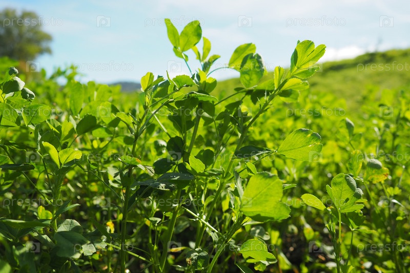 Поле с зеленым клевером. Организованная посадка клевера. Clover Trifolium, род растений семейства бобовых Fabaceae, Moth Faboideae. Медонос сельскохозяйственных культур, кормовое растение, сидераты