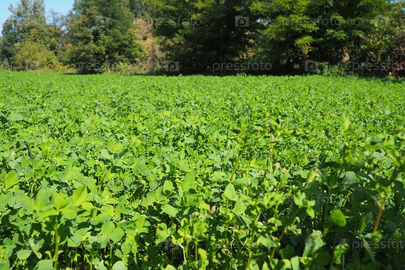 Поле с зеленым клевером. Организованная посадка клевера. Clover Trifolium, род растений семейства бобовых Fabaceae, Moth Faboideae. Медонос сельскохозяйственных культур, кормовое растение, сидераты
