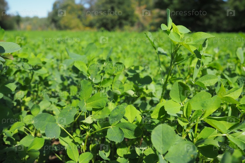 Поле с зеленым клевером. Организованная посадка клевера. Clover Trifolium, род растений семейства бобовых Fabaceae, Moth Faboideae. Медонос сельскохозяйственных культур, кормовое растение, сидераты