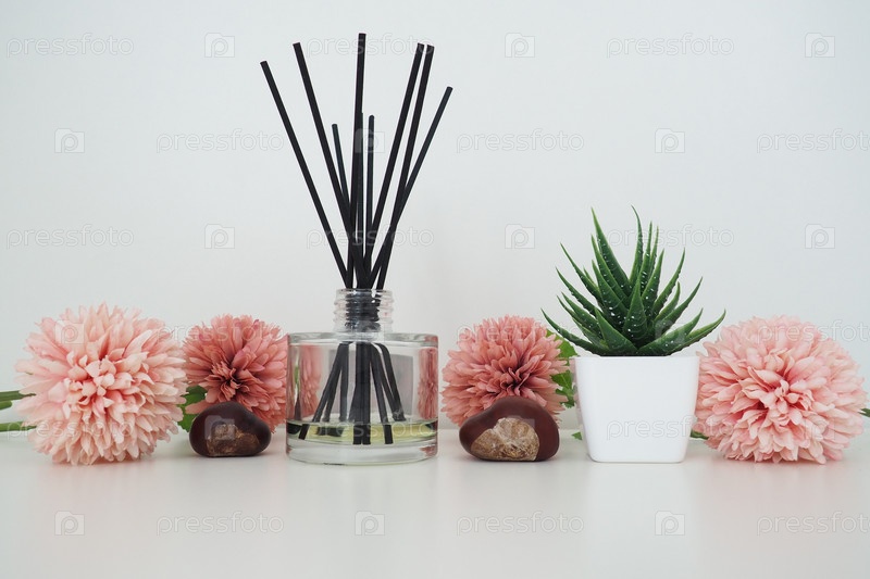 Композиция из розовых искусственных цветов, ароматических палочек в стеклянной вазе с эфирным маслом. Натюрморт на белом столе. Цветок алоэ в белом горшке. Декор комнат и квартир, дизайн интерьера