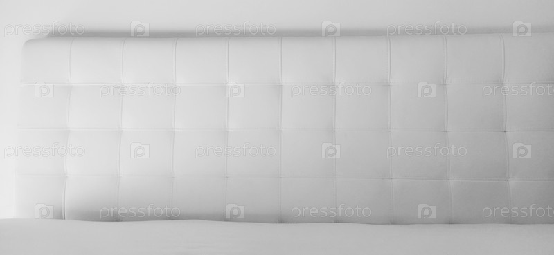 Мягкое изголовье. Обивка для мебели из натуральной или искусственной кожи и стеганой ткани. Мягкое изголовье у светлой стены. Черно-белое монохромное фото